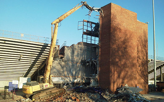 D. H. Griffin Wrecking contracted by Furman University to provide the demolition and removal of the stadium press box and miscellaneous associated concrete structures. DHG utilized special heavy equipment including long arm attachment with pulverizer to safely bring down the structures.